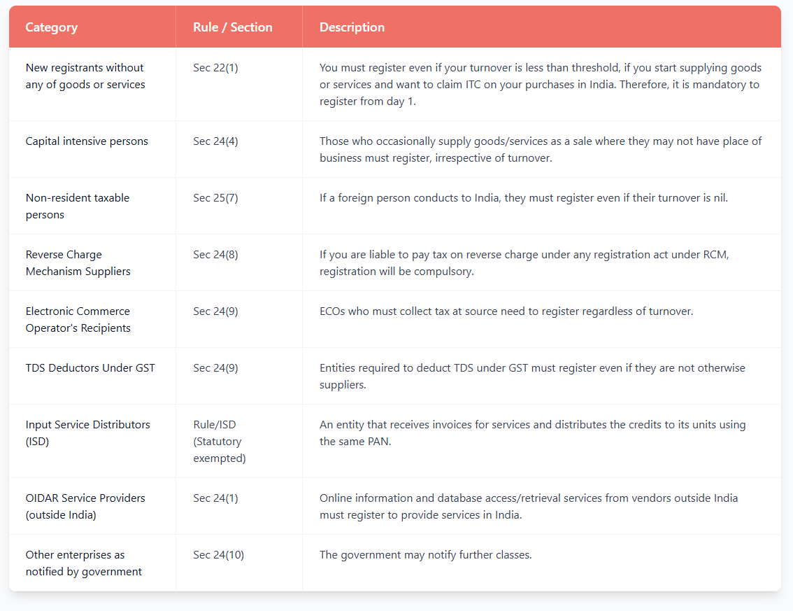 While you may think of registration being tied merely to crossing certain turnover limits, Section 24 of the CGST Act imposes mandatory registration on various classes of persons even if their turnover is below thresholds. Here are key categories: