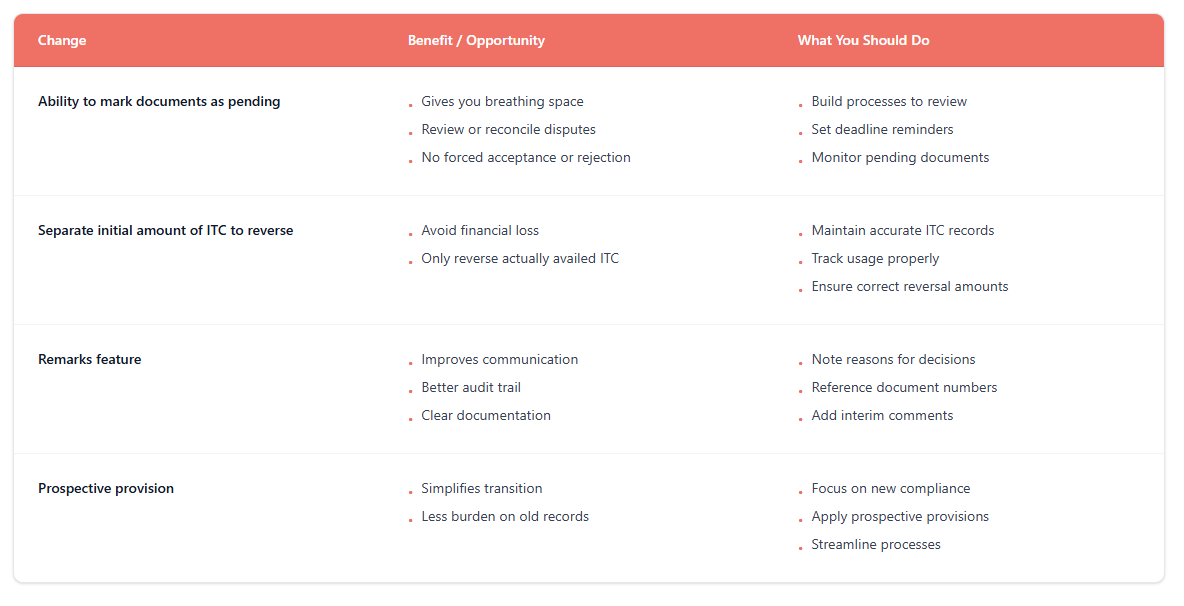 Plan for Transition Since the changes are prospective, your current accepted/rejected records remain unaffected. But for new invoices, credit/debit notes, maintain rigorous documentation and review timelines.