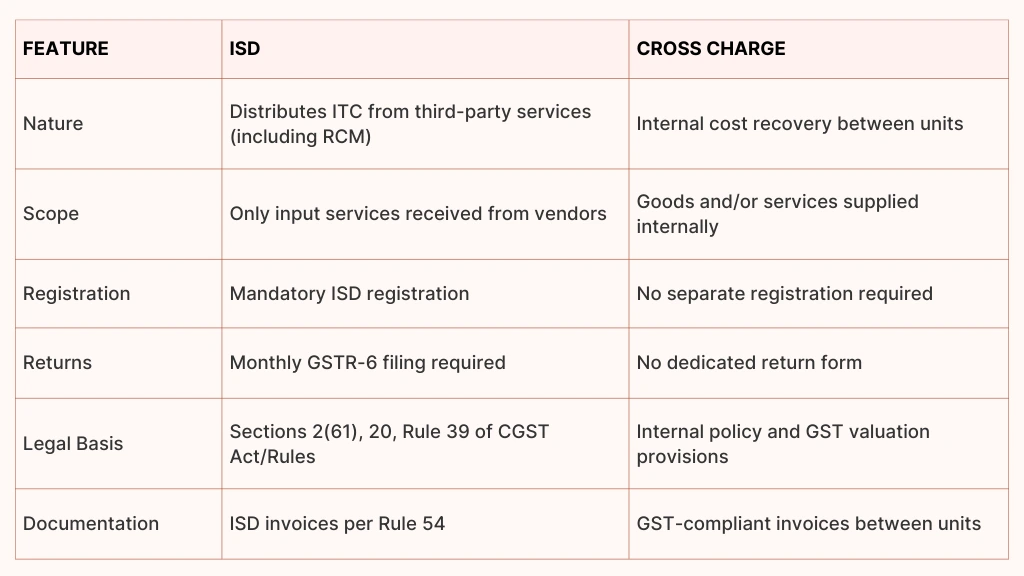 Cross charge refers to internal invoicing between units or branches (with same PAN but different GSTINs) for services or goods supplied internally. It’s a mechanism used to recover costs but isn’t governed by ISD-specific provisions.